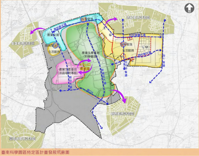 台南市政府為因應南科台積電設廠帶動住商及交通需求,地政局首先於善化區及新市區辦理「南科特定區開發區塊F、G區段徵收」開發,開發區面積100.13公頃,提供可建築土地64.02公頃、公共設施31.85公頃、灌排專用區0.26公頃及農業區4公頃,可強化台南科學工業園區周邊生活服務發展環境,並整備特定區交通及防救災系統,引導科學園區周邊土地有序漸進發展,目前區段徵收範圍及抵價地比例報送中央審查中,預計明年啟動徵收公告及工程作業。